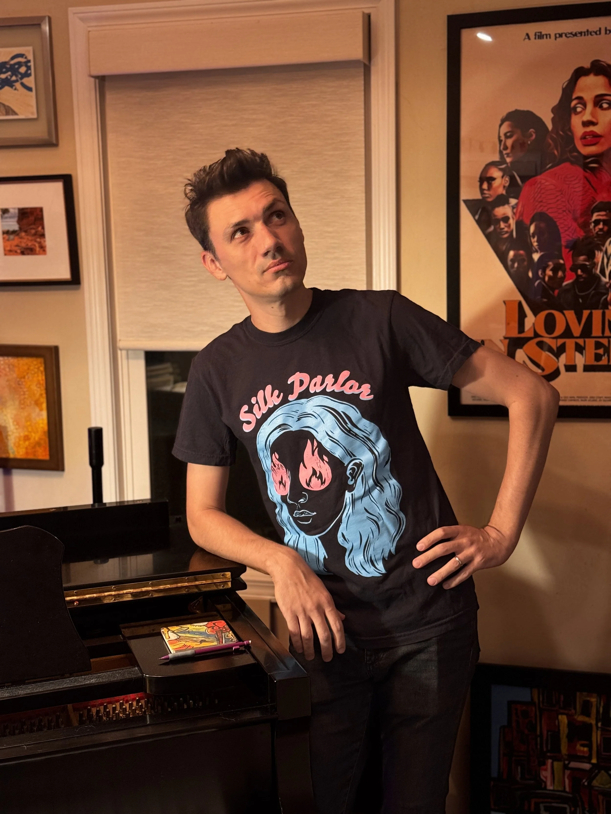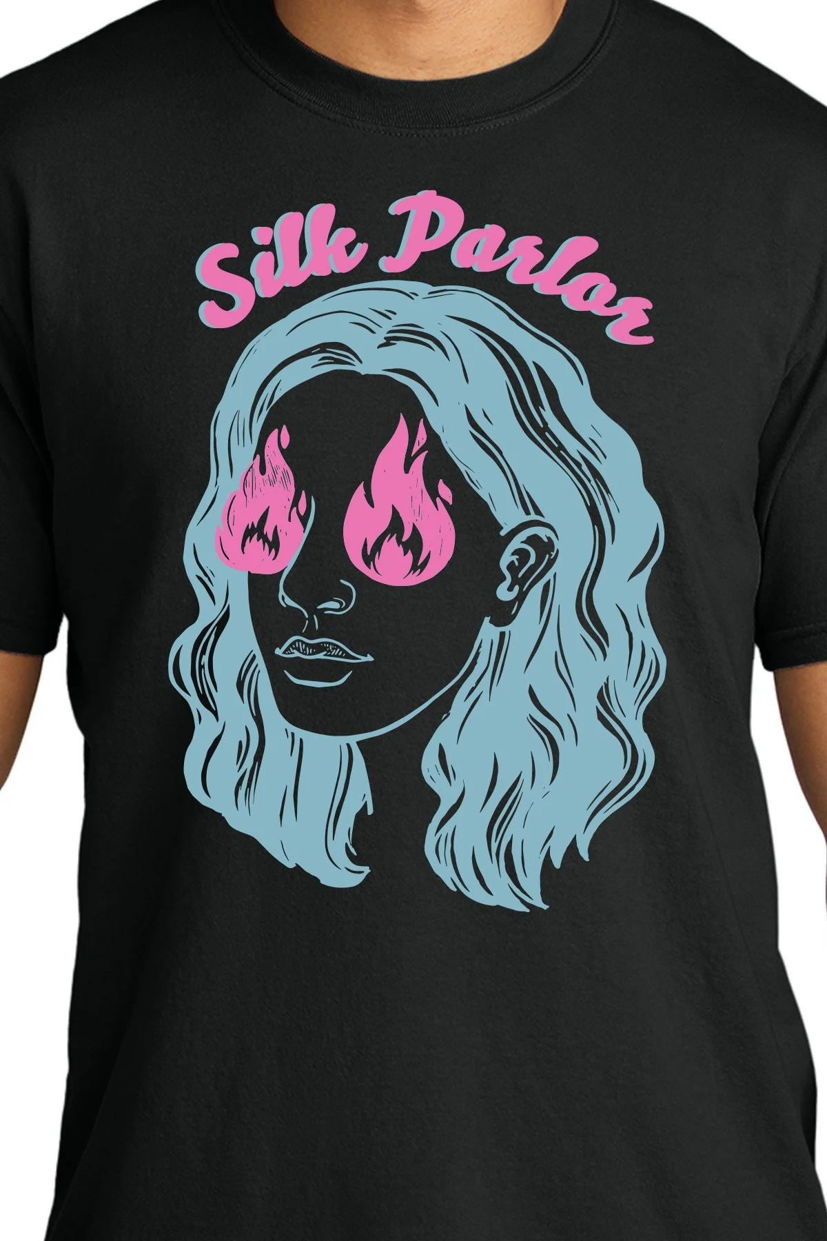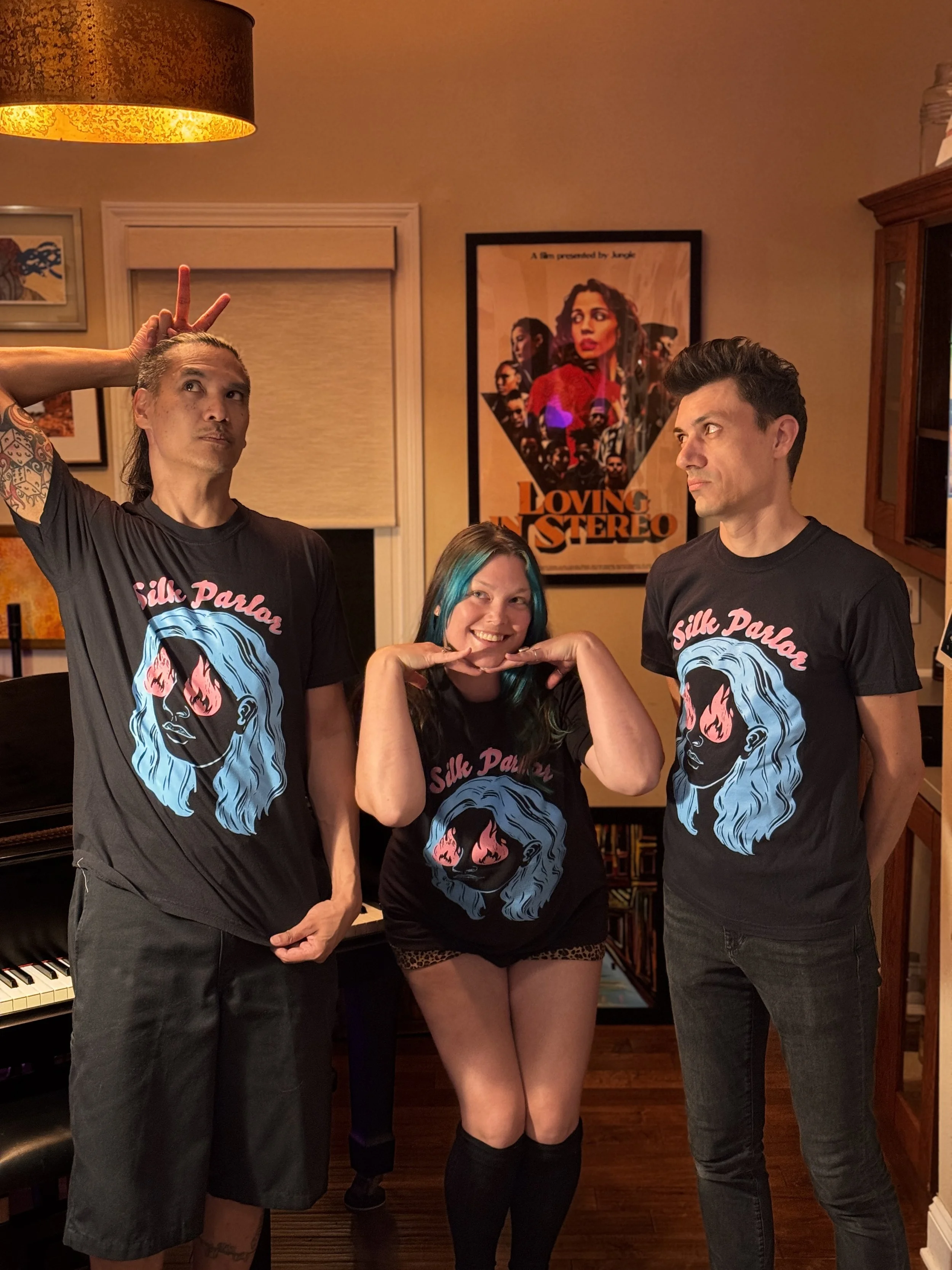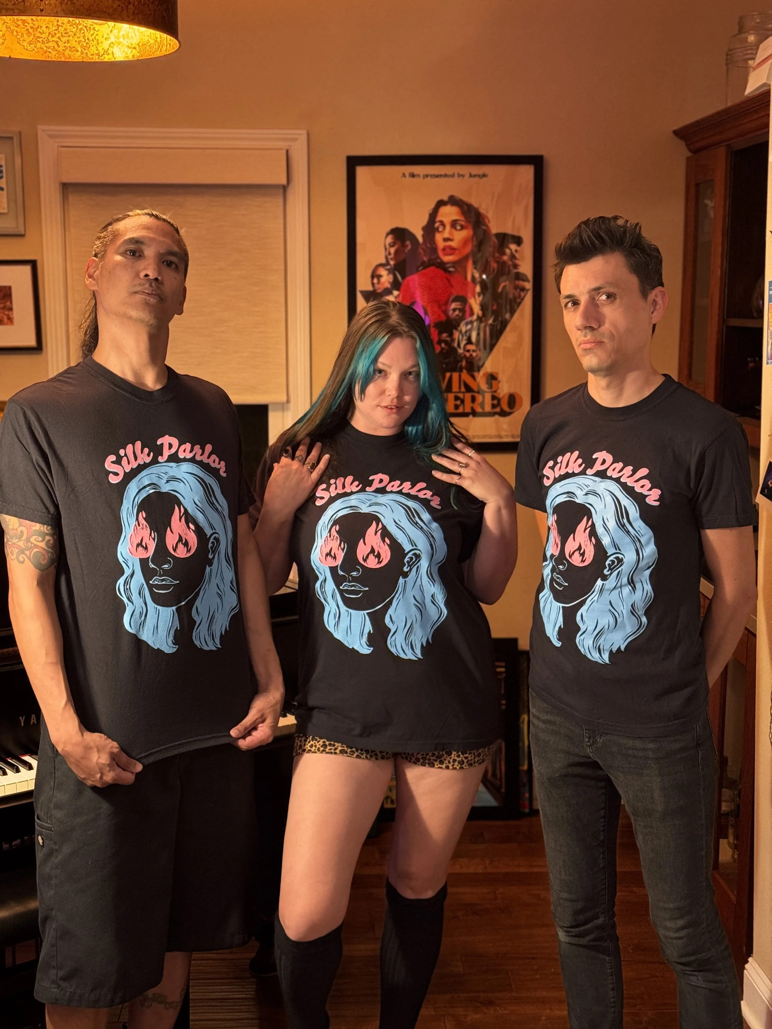 I met Silk Parlor at a show my band was headlining. They complimented my show flyer and our band’s merch, and I offered to design something for them in exchange for a shirt when it gets printed. After a couple iterations, we landed on this fun pink flame girl, which was printed locally at Modest Merch in Chicago, Illinois. The band loves the shirt, and it’s printed on a super soft Comfort Colors garment. Check out their music below, dance around, and stop by their next show.